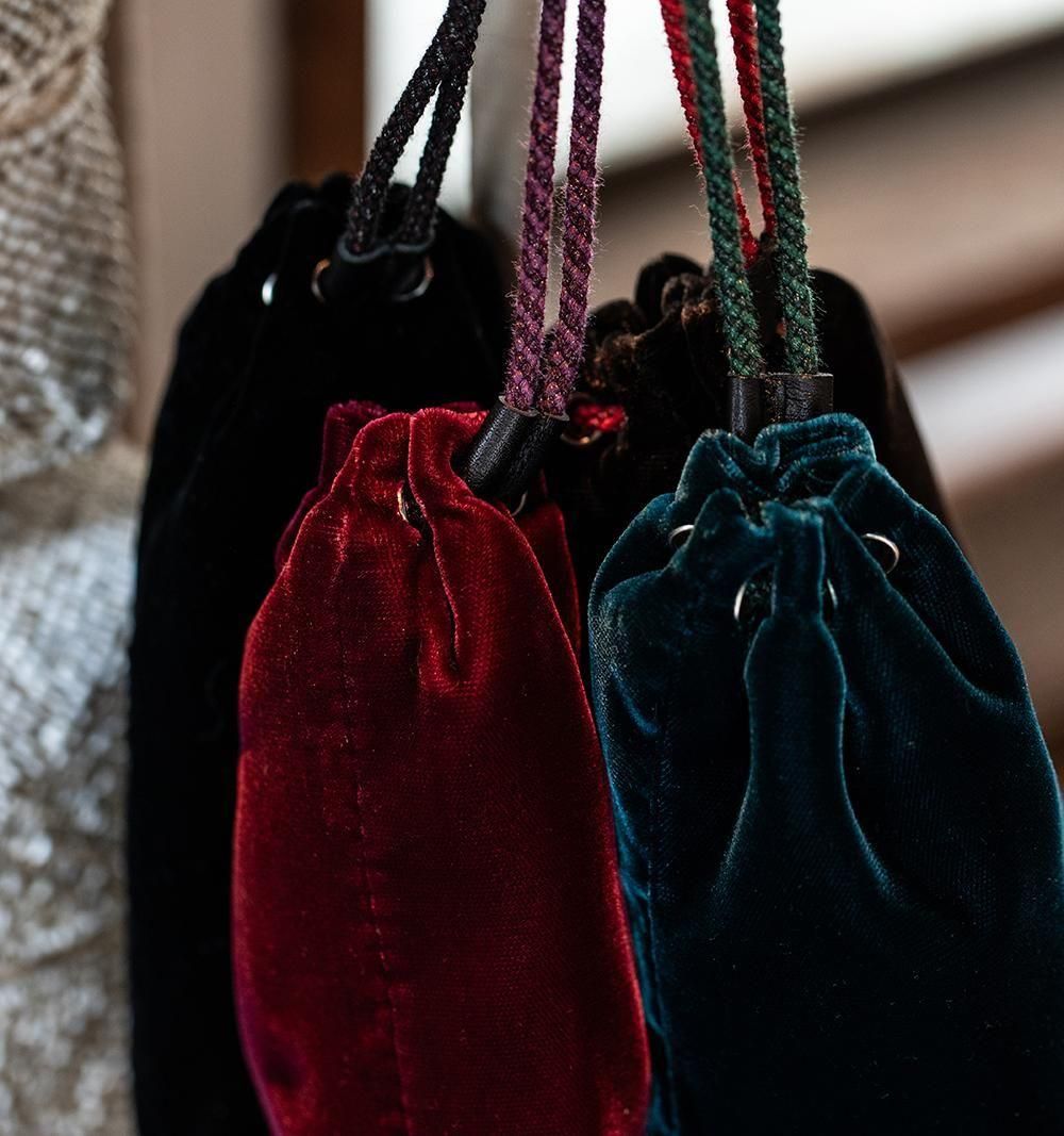 落ち着いたカラーのベルベットに上品な光沢のメタルパーツとラメを織り込んだ紐を組み合わせたシックなデザイン。