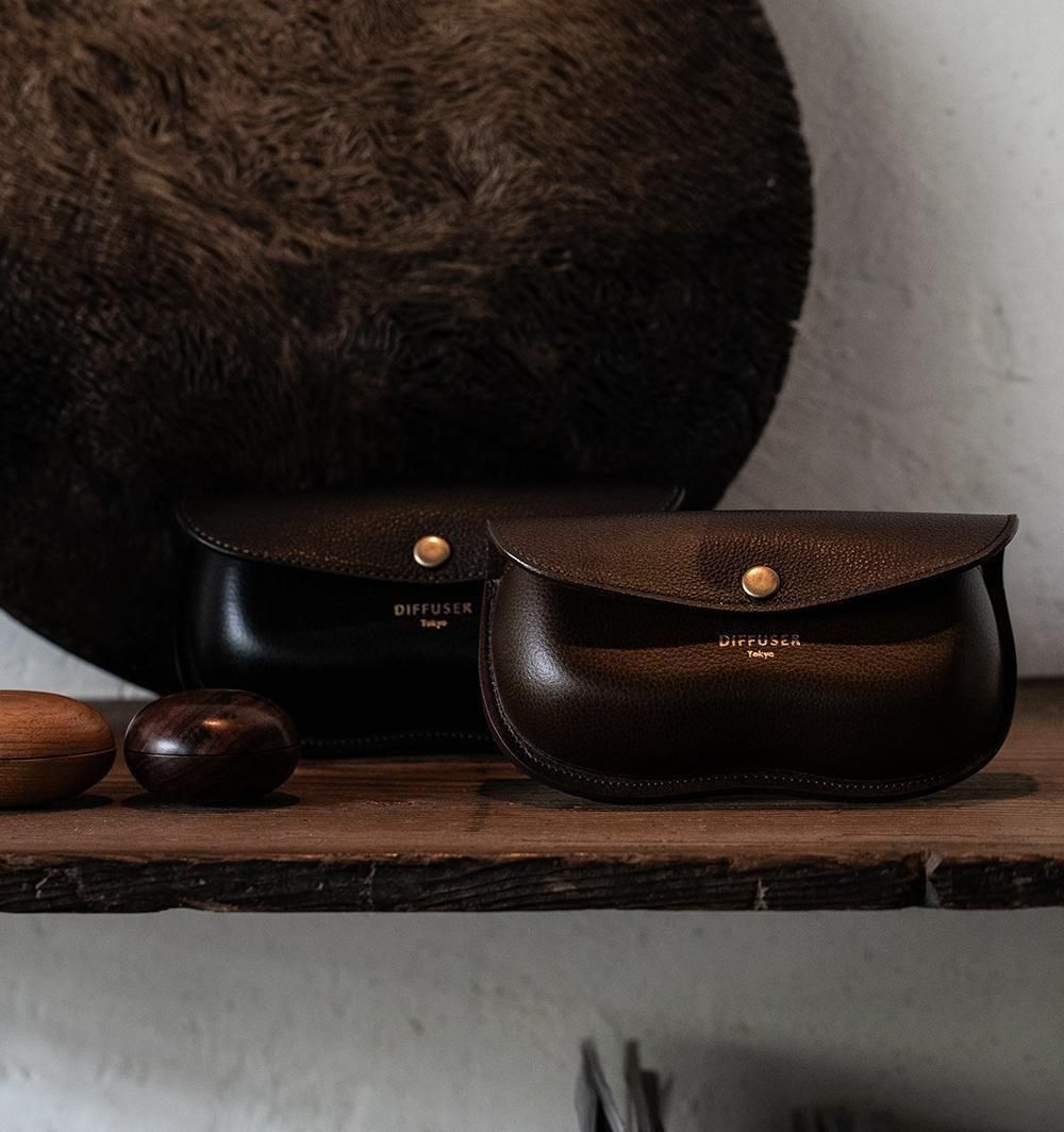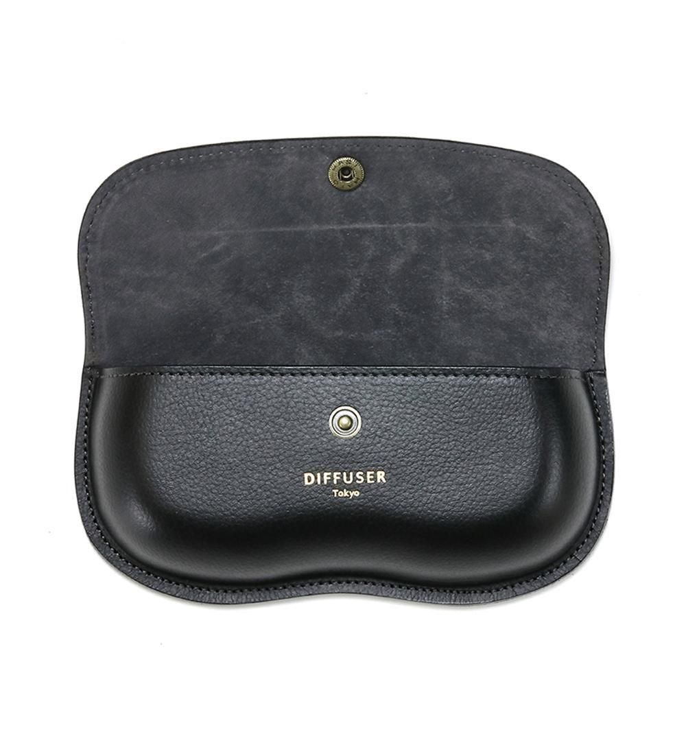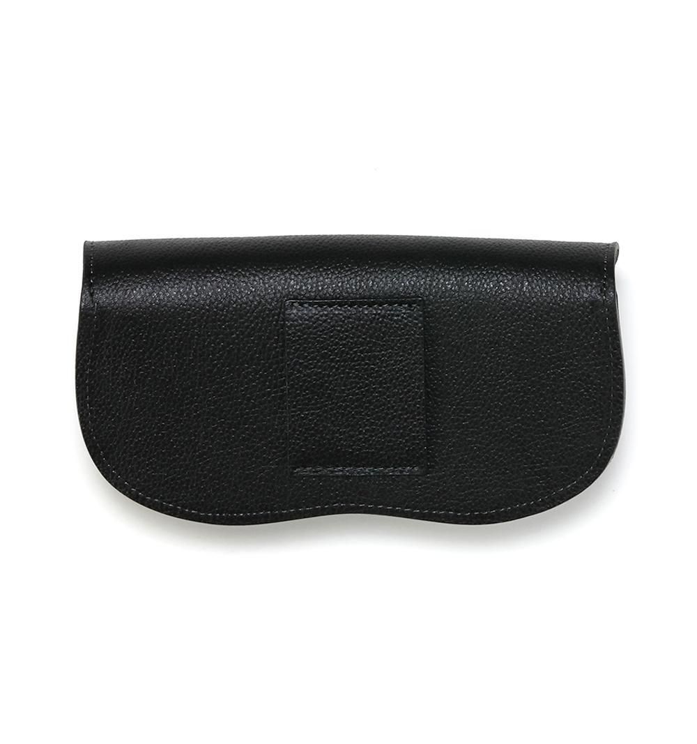 ベルトやストラップを通せる水絞り眼鏡ケース眼鏡ケースのデザインに対して一定の需要があるのがベルトに通せる機能です。普段カバンなどをあまり持たない人にとって、これほど便利な眼鏡ケースはないと思いますが、さらに機能性をアップデートしたデザインにしました。魅せるケースとしておしゃれに、ファッションのポイントとなるように形状にこだわりました。この独特のシルエットを実現するために水絞り製法によって製作をしました。大きめのサングラスも格納できるように、ケースの入り口から底までマチ幅が変わらない構造に設計しています。3日かかる立体成型水絞り革成型とは、タンニン革の特性でもある可塑性(力を加えて変形させると、元に戻らないという性質)を利用した成型技法で、水分を含ませた革を木製の成型枠に挟みこんで、立体的な革を成形する製法です。この成型には3日ほど時間がかかり、とても手間がかかるのと、さまざまな条件によって革の変化も異なりますので、長年の経験と高い技術力が必要になります。このケースでは芯材にタンニン革を使用してまして、水絞りによって強度がましてますのでセミハードケースとしてお使いいただけます。表面の革はクロムなめしの革になりますので経年変化は起こりません。コーディネートのアクセントしての使い方ベルトに通して腰から下げたり、ショルダーバッグのストラップに通し2連のカバンのようにすることもできます。ぜひ、そのコーディネートをお楽しみください。□サイズ   外寸:幅18cm 高さ9.5cmマチ4.5cm 内寸:幅15.5cm 高さ7cmマチ3cm
