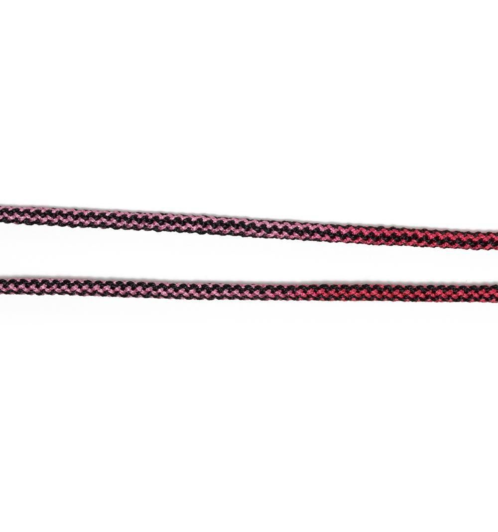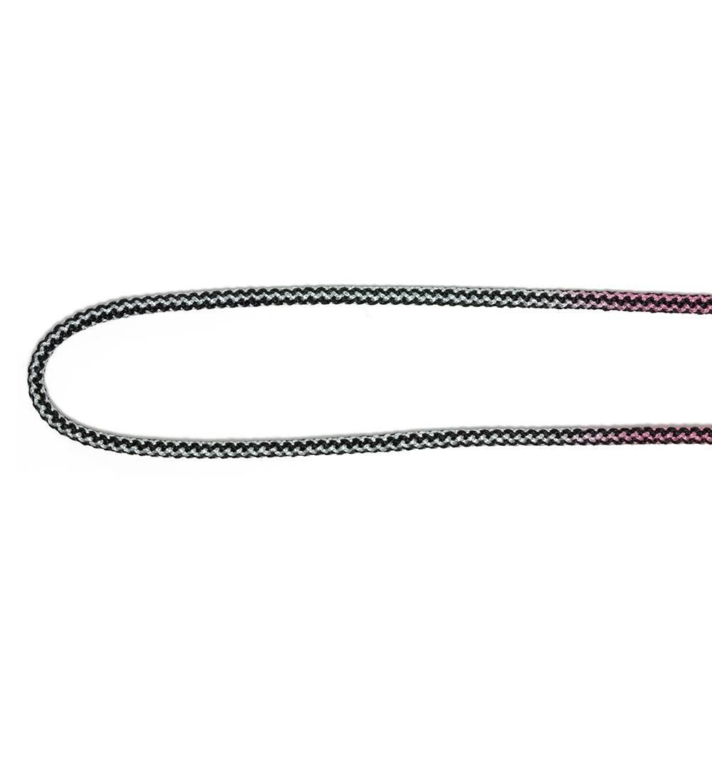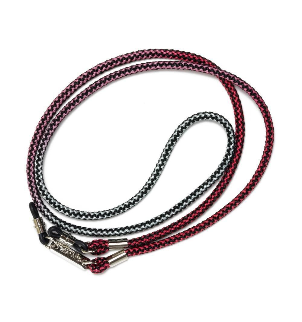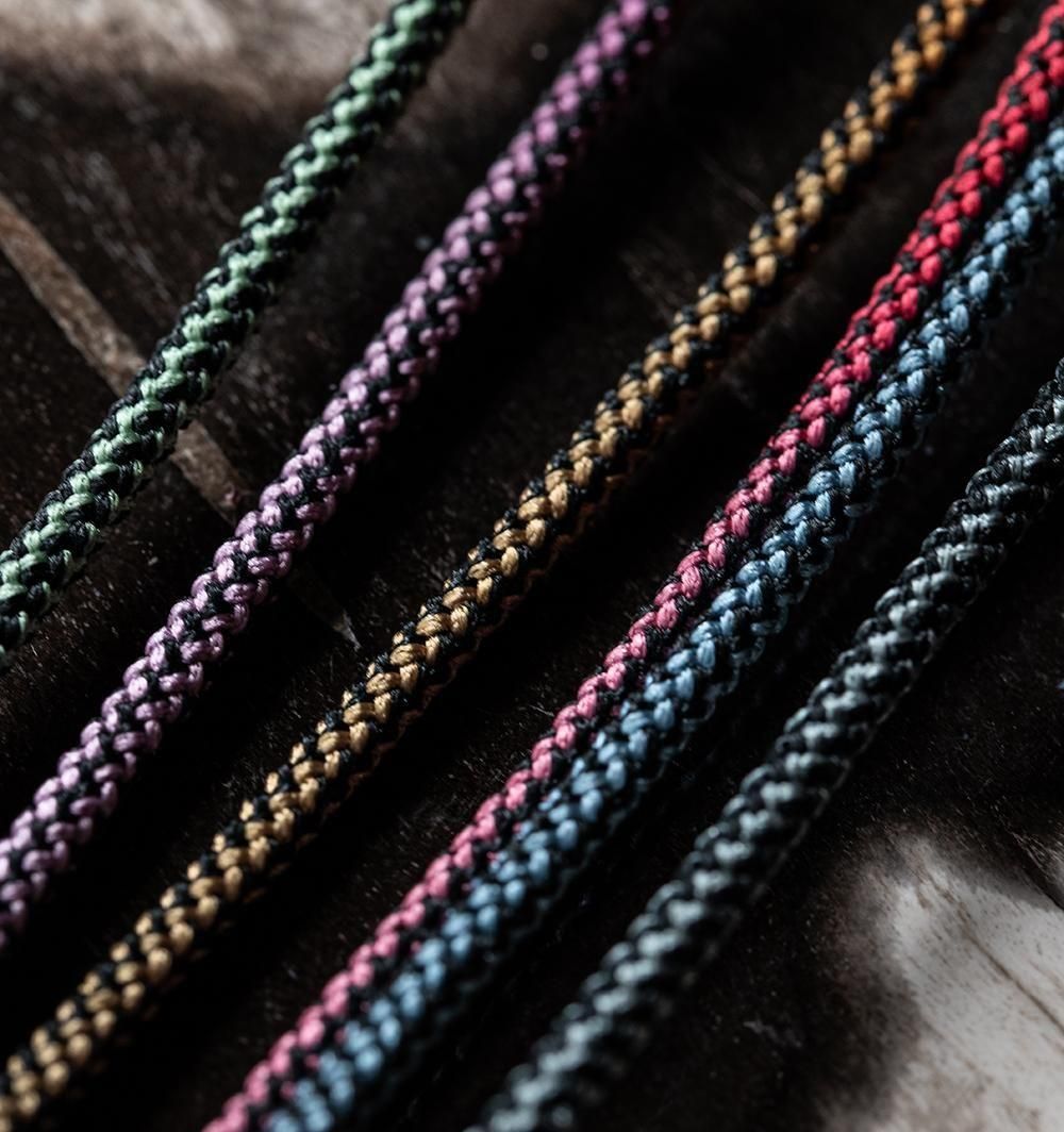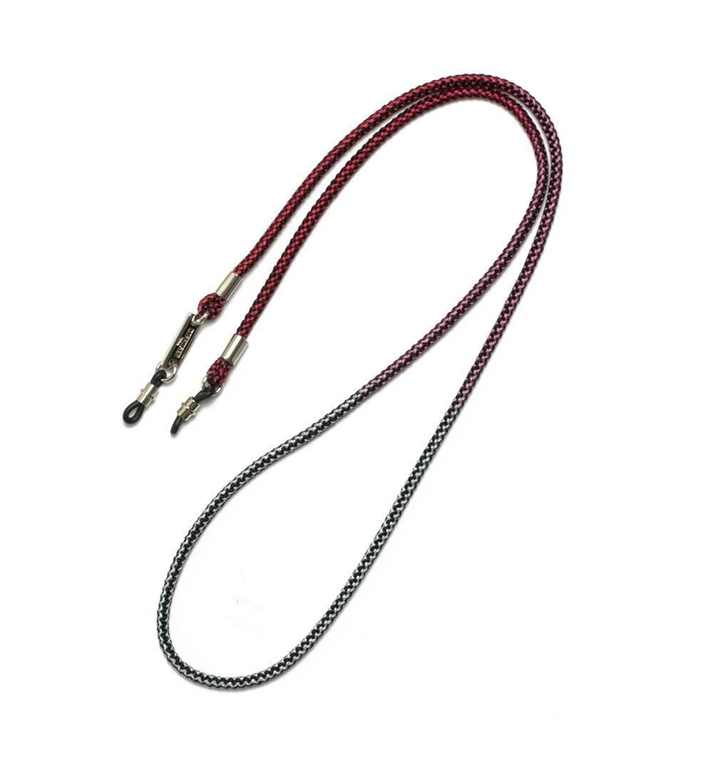 本製品のコードの素材はポリエステルで、肌触りがよく、柔軟性もあります。黒いラインのコントラスト本製品の下地となるコードは、福井県の工場で黒い糸と白い糸で組み上げ、黒い波模様が柄としてでるようにしました。その上で京都の染色工場で、白い箇所にのみ染色を施しています。また他のグラデーションのグラスコードとは違い、発色の出方を抑え優しい色の仕上げにしています。金属パーツはシルバー色で統一し、軽い印象を与えるデザインに仕上げています。以下は商品の詳細になります。