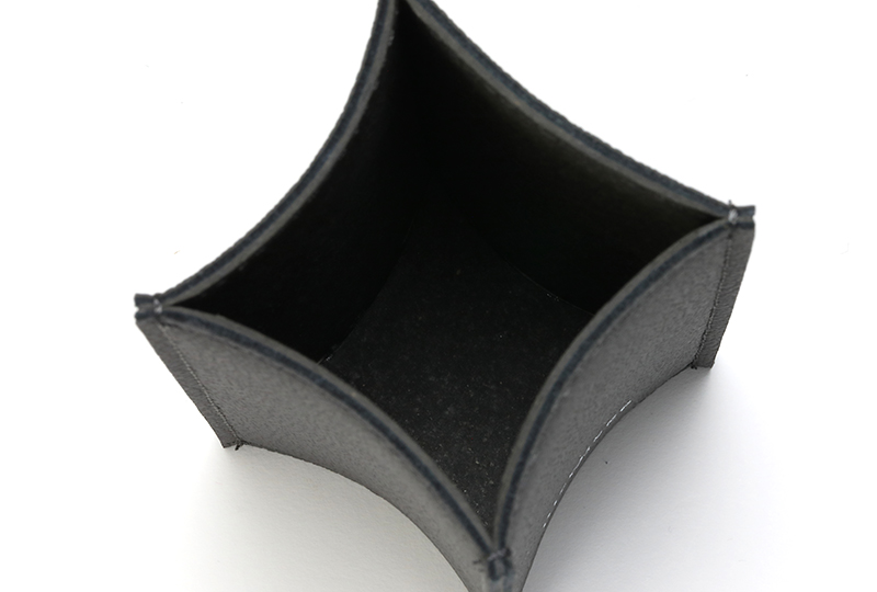 しかし、このRECYCLE LEATHER EYEWEAR STANDは、従来の概念を覆すデザインを採用した。側面が内側に向かって反るような、独特の曲線を描いているのだ。