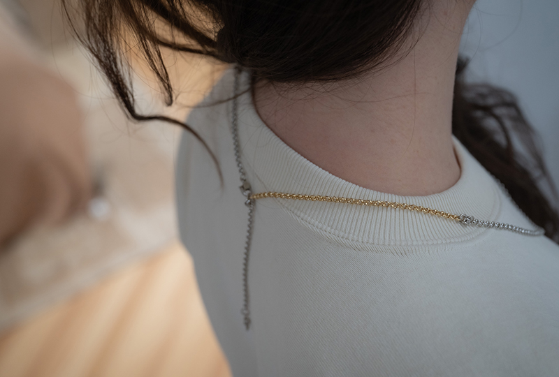 軽さと存在感のバランス、長さ調整の機能性、そして顔まわりをすっきり見せる工夫。すべてが計算されたデザインによって、ユニセックスで使いやすいチェーンが完成した。
