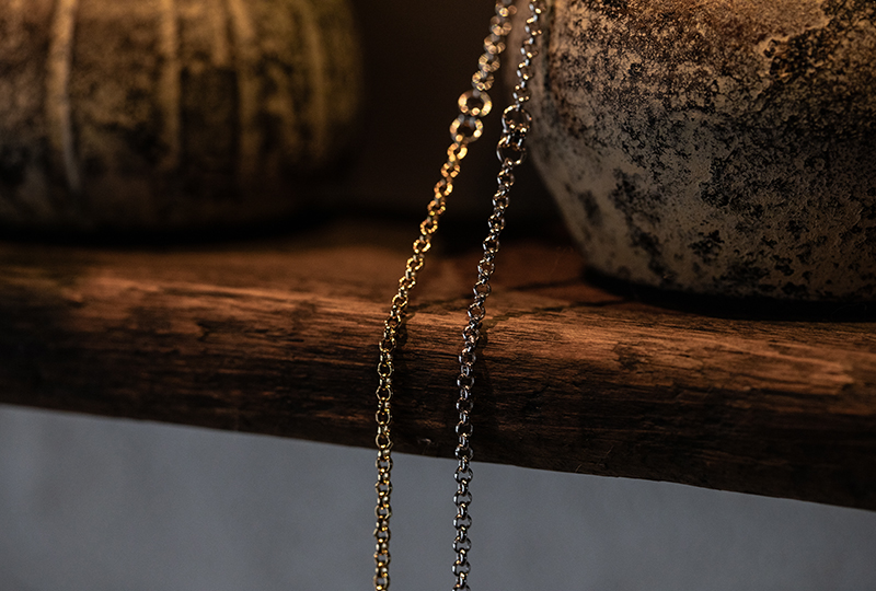 このチェーンは、性別を問わず使えるデザインとして開発された。ロロチェーンのシンプルな美しさは、男性にも女性にも自然に馴染む。