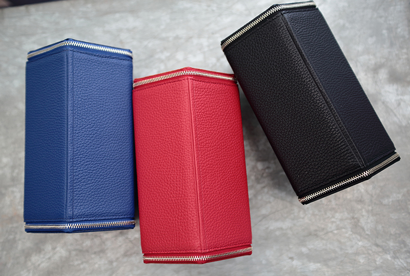 STORAGE BOXシリーズの3つのモデルをつなぐ共通要素のひとつは、イタリア産シュリンクレザーだ。シュリンクレザーとは、革の表面に細かなシボ(しわ模様)が施された素材で、傷が目立ちにくく、もっちりとした質感が特徴だ。