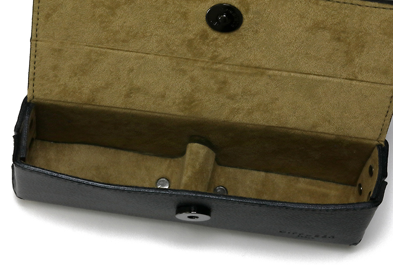 また、ケースの内側は、眼鏡のブリッジ部分を固定できる形状となっている。柔らかなスエード素材で仕立てられた内部は、眼鏡をしっかりと保持し、ケース内での不要な動きを防ぐ。