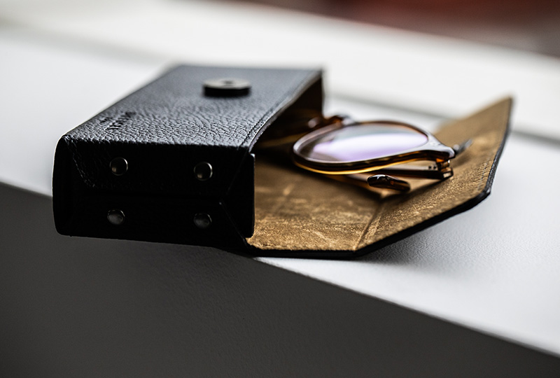 多くのメガネケースが丸みを帯びた形状をしている中で、SHRINK LEATHER RECT EYEWEAR CASEは直線を基調としたデザインだ。