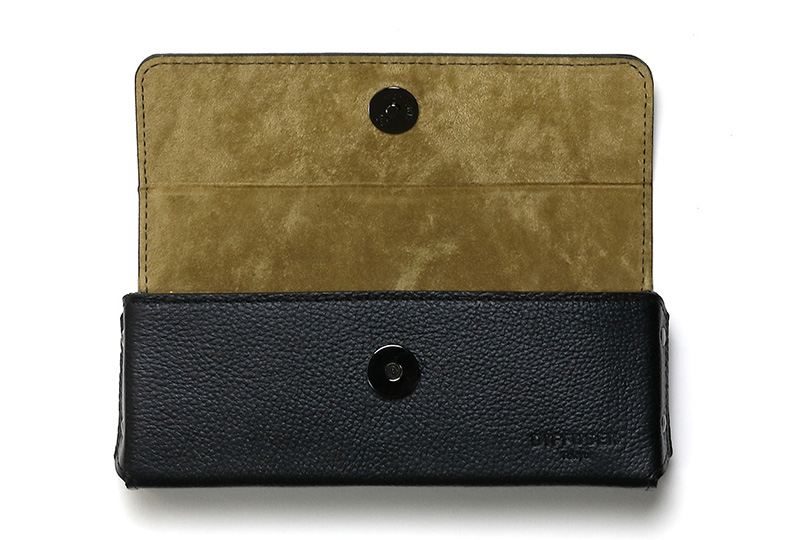 通常、革製品の接合にはミシンによるステッチが用いられることが多いが、SHRINK LEATHER RECT EYEWEAR CASEではあえてステッチを極力減らし、金属パーツであるカシメを打ち込んで留めるという製法を採用した。