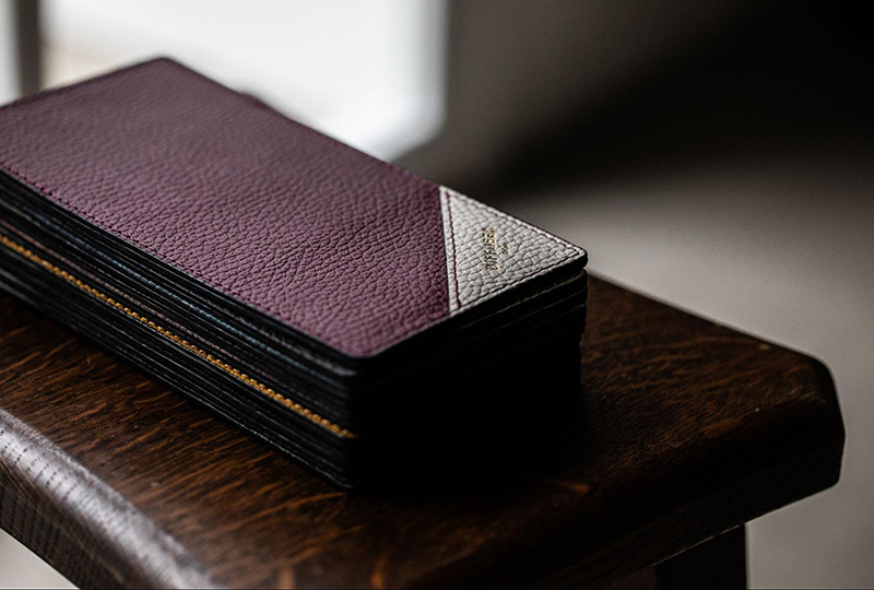 ポケットの中では薄く静かに収まり、ジャケットのシルエットを崩さない。しかし、ひとたび取り出せば、シュリンクレザーの豊かな表情と華やかなバイカラーデザインが、周囲の目を引きつける。